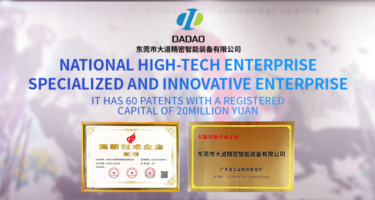 大道精密成立于2019年,公司注册资本1000万元,拥有办公室、厂房等18,000多平方米。已通过ISO9001:2015国际质量管理体系认证,拥有国家各类专利共计58项,获得“中国大道.商标”和“一带一路十周年 .国礼品牌”等荣誉称号,属于国家高新技术企业,专精特新中小企业。2023年4月成立了“东莞市大道精密智能装备有限公司关心下一代工作委员会”,是东莞市企石镇工商联副会长单位、东莞市企石镇文学艺术界联合会副主席单位、东莞市环保包装行业协会副会长单位、东莞市数控装备行业协会第二届会长单位、广东省包装技术协会常务理事单位、广东省胶粘剂行业协会理事单位、国家标准《机械安全中安全防护授权系统的基本要求》起草单位。